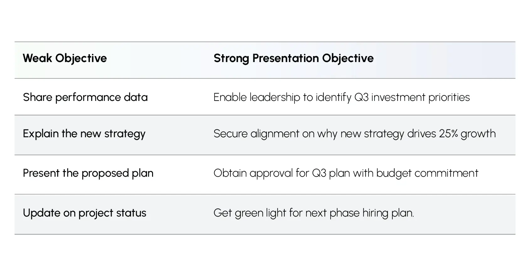 This table shows how reframing objectives from activities to outcomes creates more focused, decision-driven presentations.